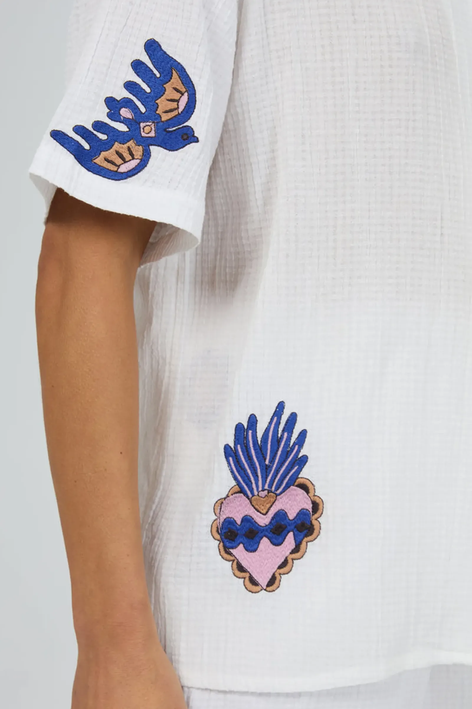 A gorgeous vintage white, textured shirt with the sweetest embellishments.