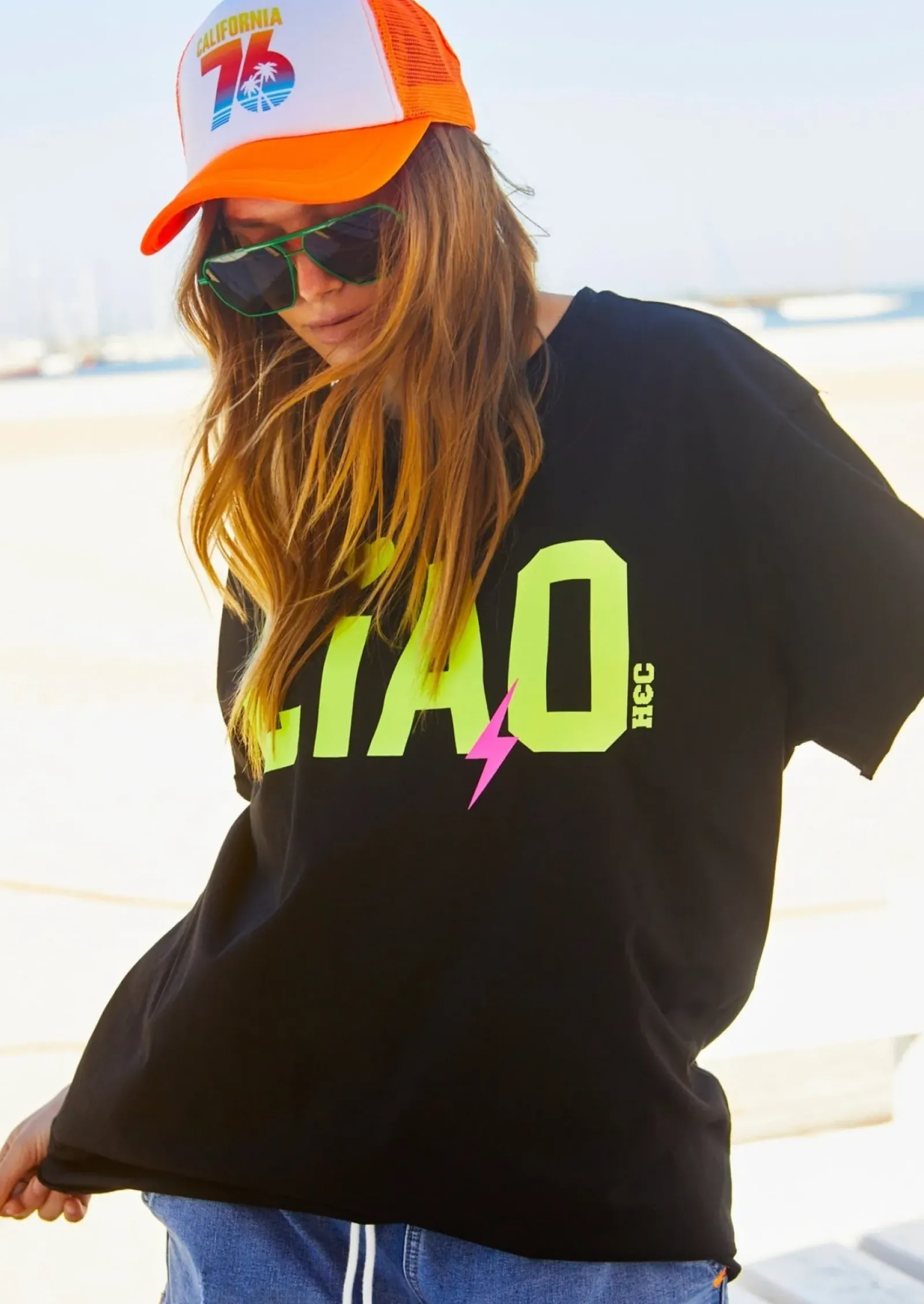 New retro inspired oversized crew neck tee. Vintage washed black body with neon CIAO print wth a pop of hot pink in the lightening.