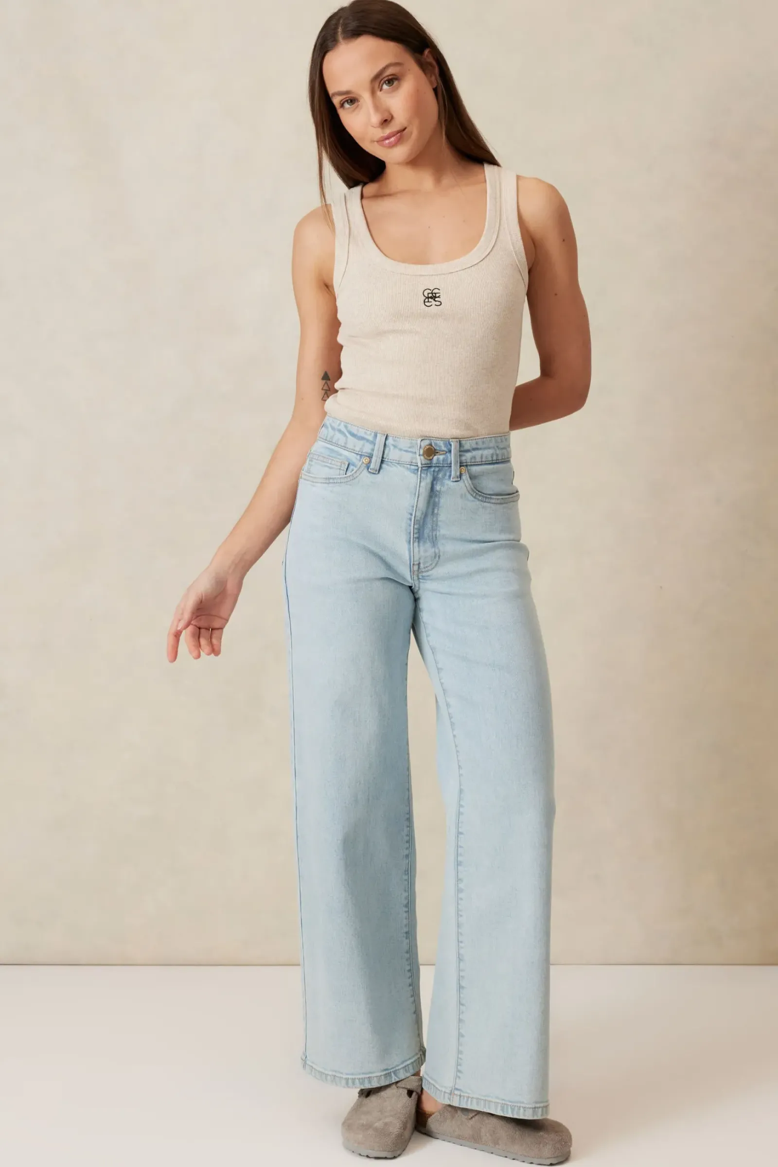 Ceres Life Contour Rib Scoop Tank – Oatmeal/Black Monogram Embroidery Fashion