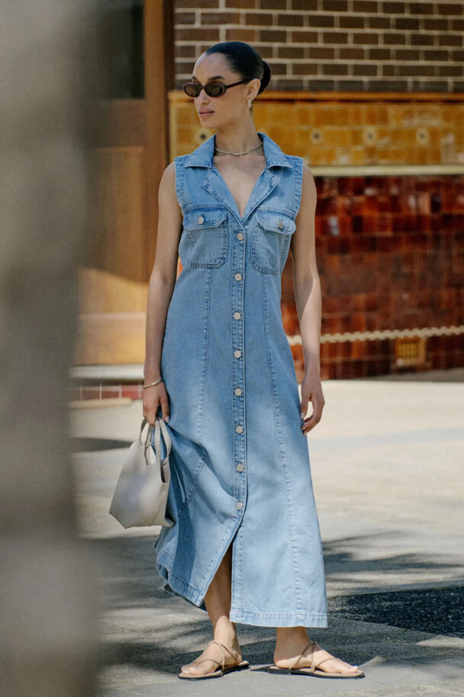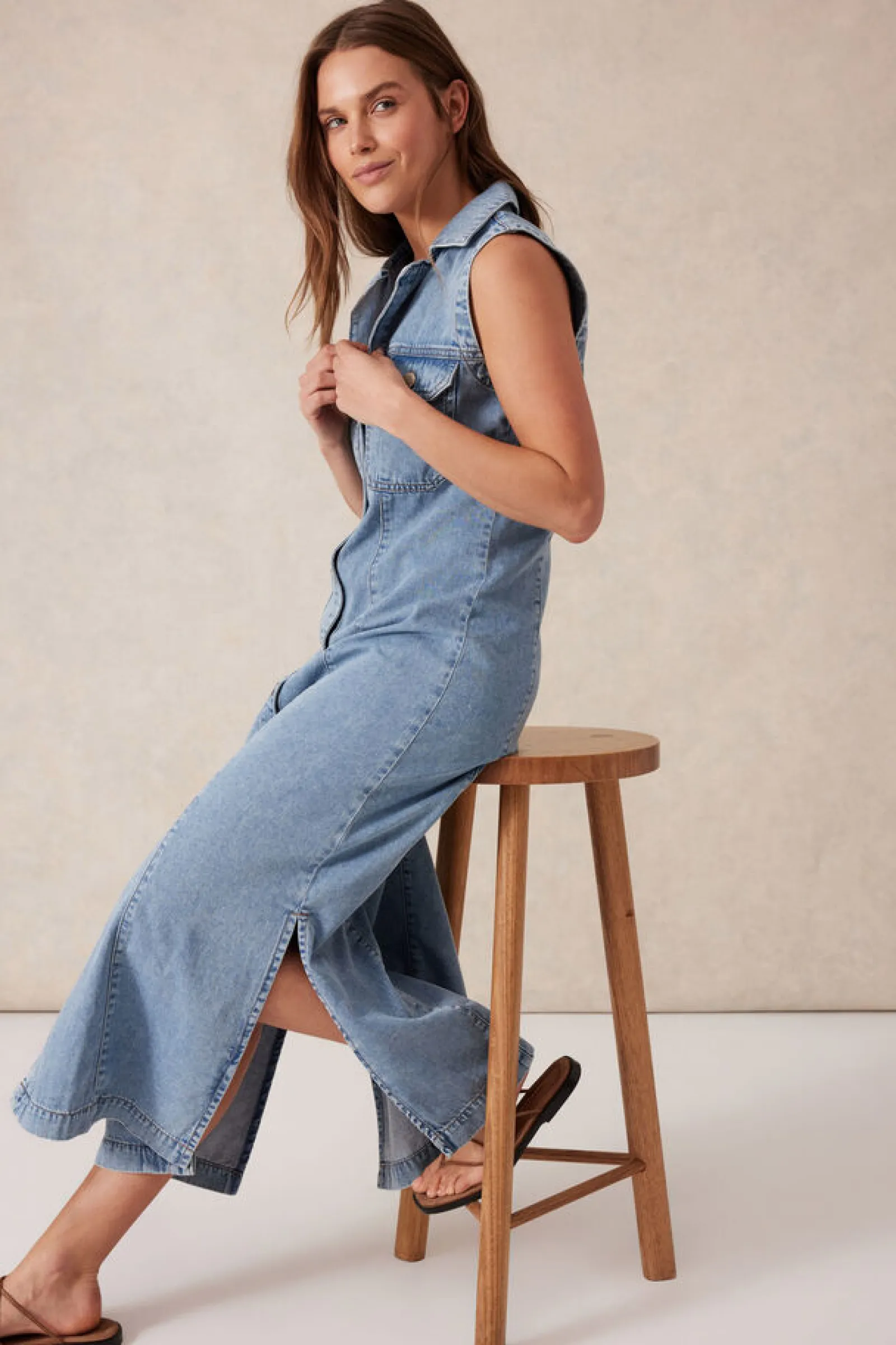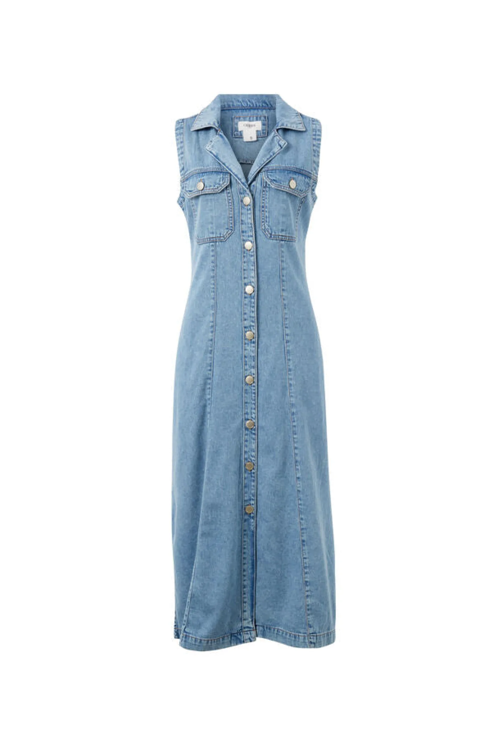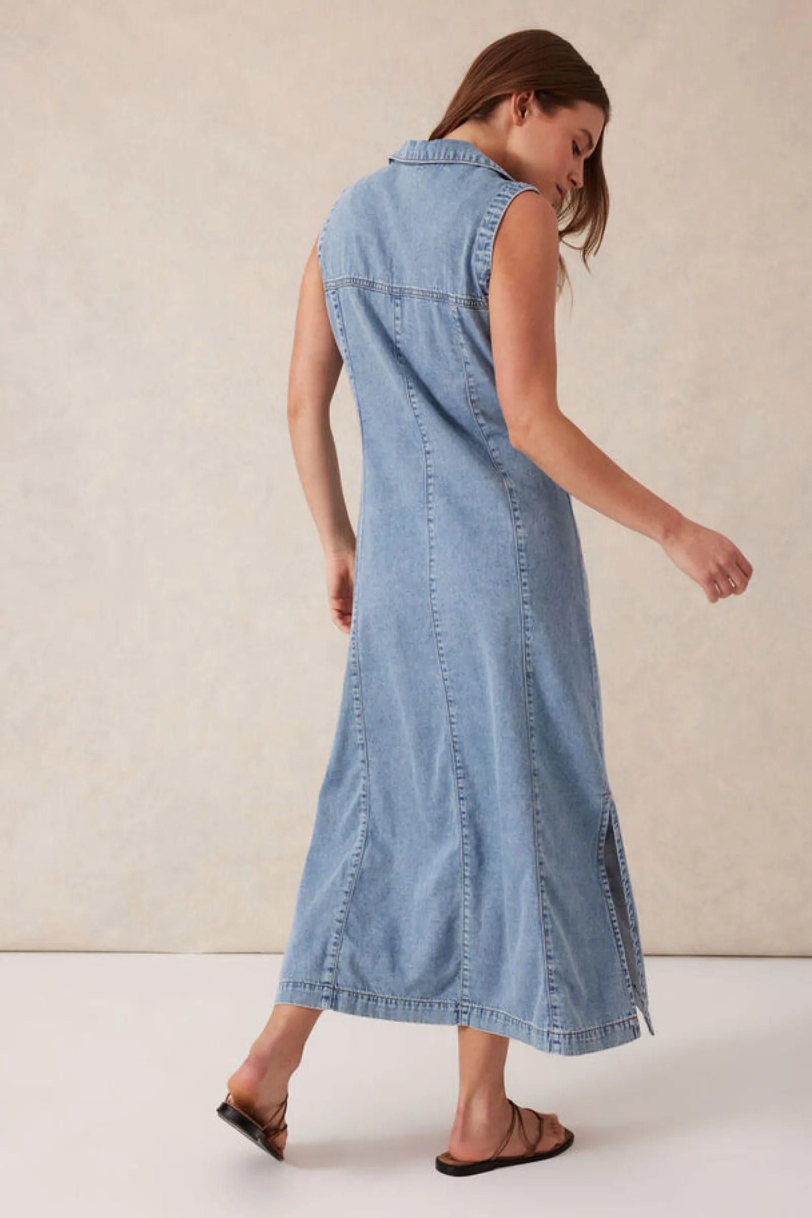 Say hello to style with our Sleeveless Panelled Midi Shirt Dress. Crafted from rescued cotton twill, featuring fit and flare styling, long midi length with side splits, and functional button-through front making it perfect for any occasion. Pair with your favourite sandals and you’re ready for Summer.