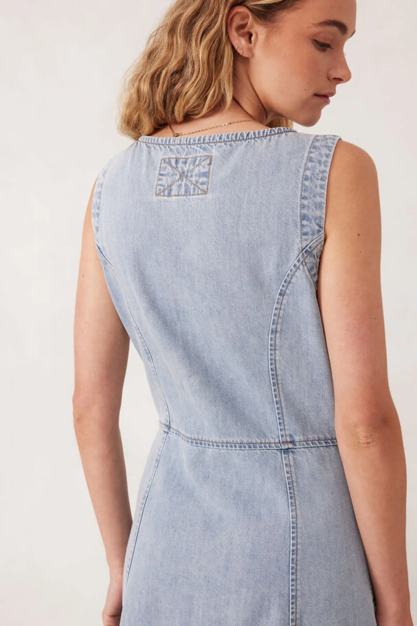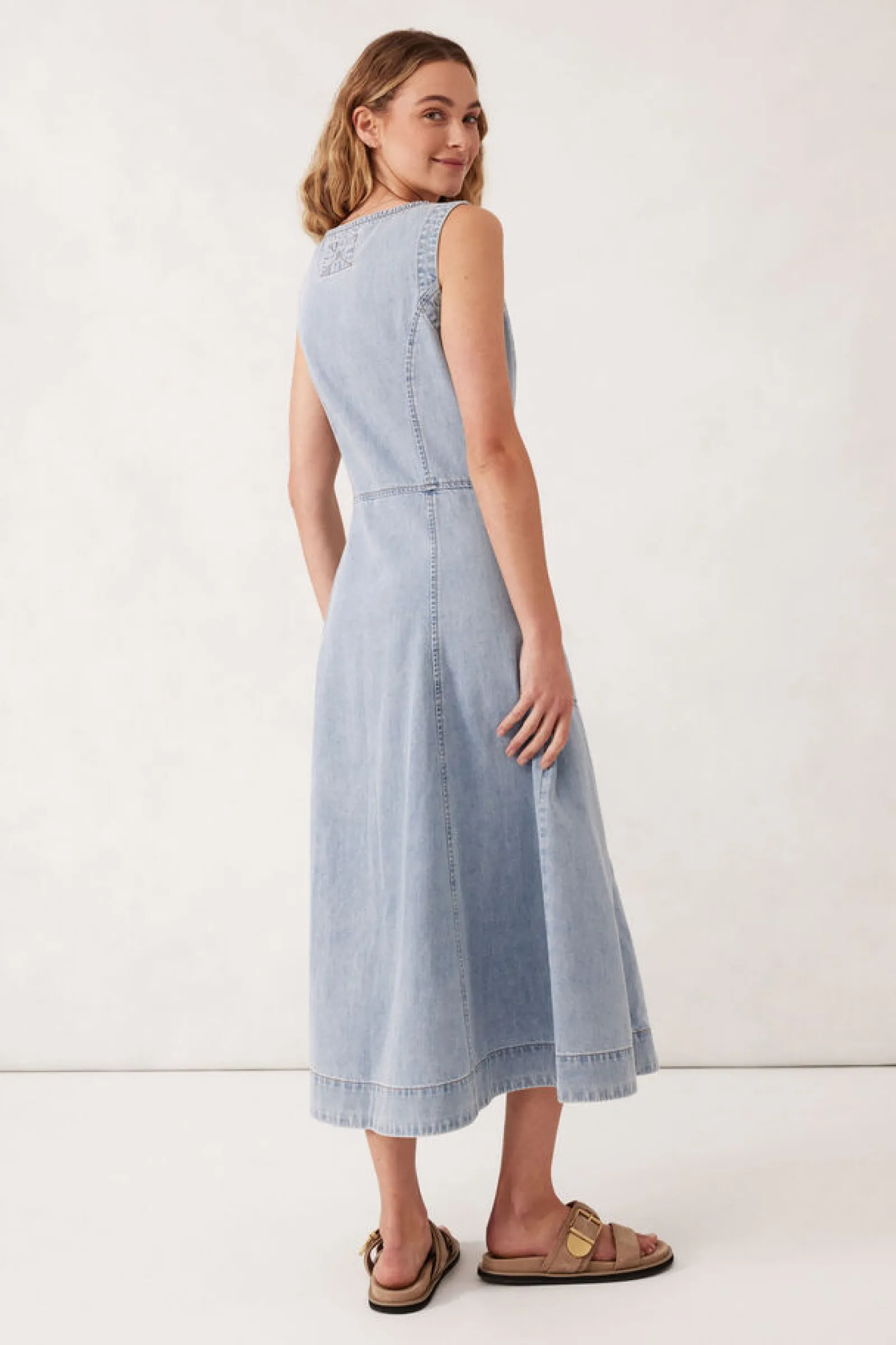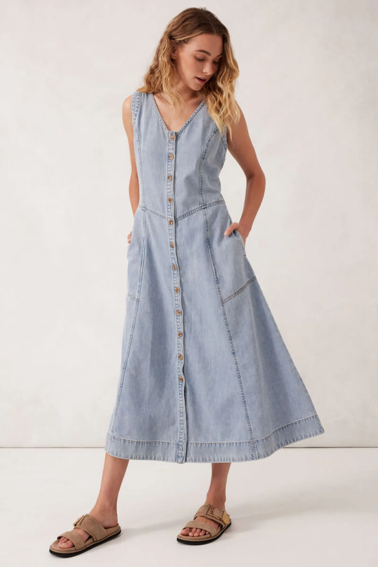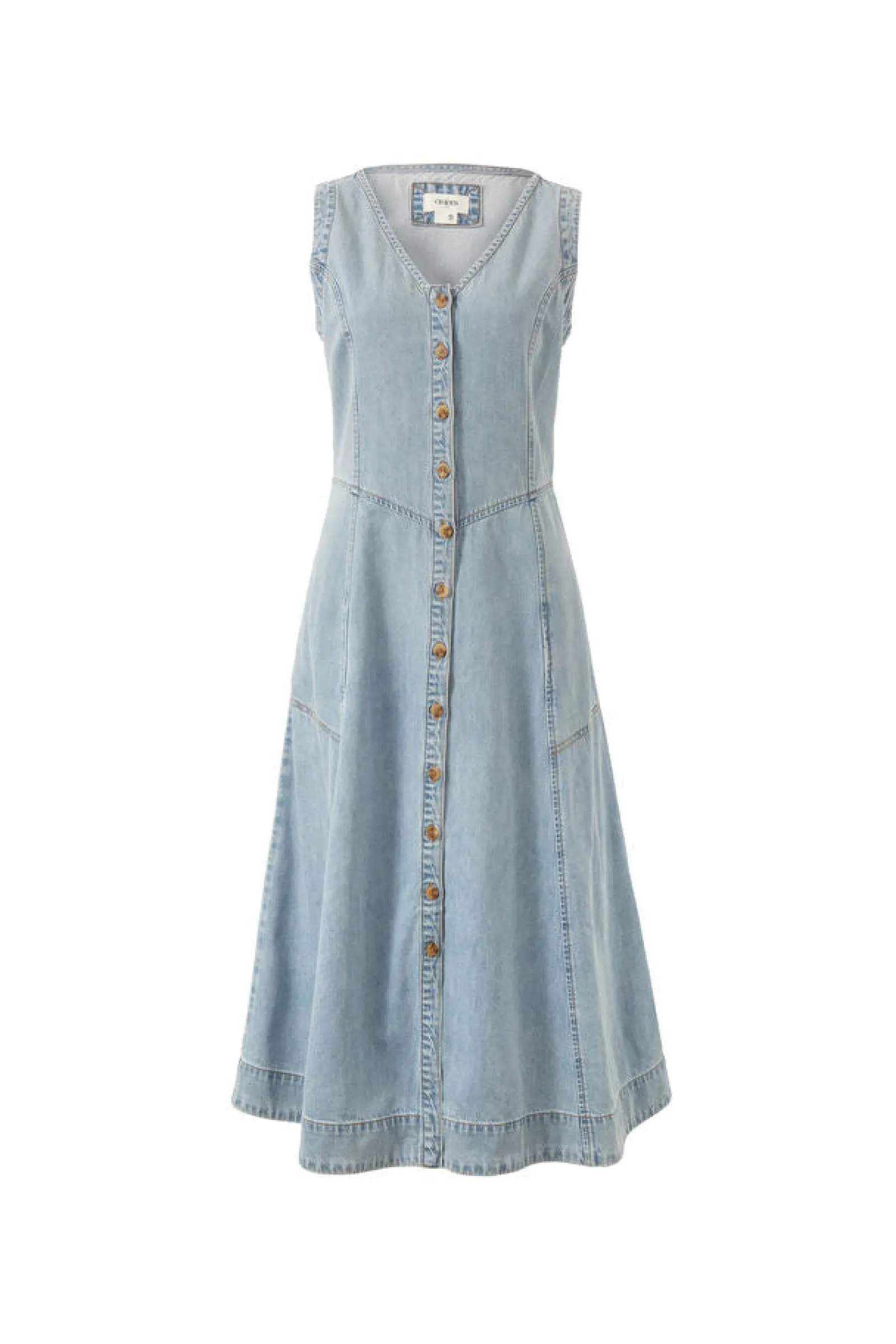 Introducing our V-Neck Flared Midi dress, crafted from lightweight denim with a soft drape, this dress boasts 100% organ…