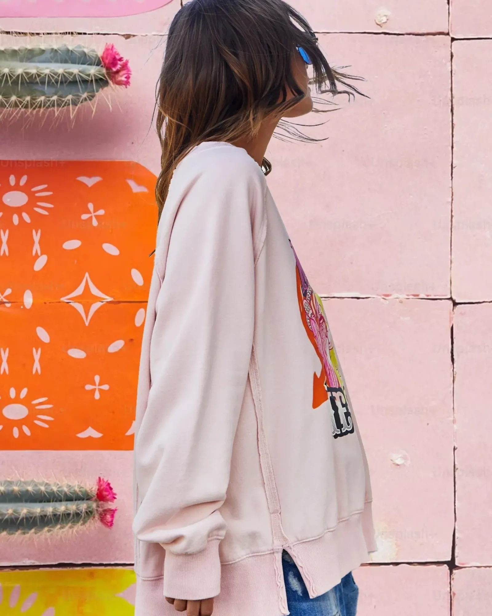 Our newest very oversized vintage wash sweat featuring raw cut v, exposed seams, wider rib waistband with side splits, raglan sleeve and new Mexican Fiesta print on the front and hand drawn logo on the back neck.