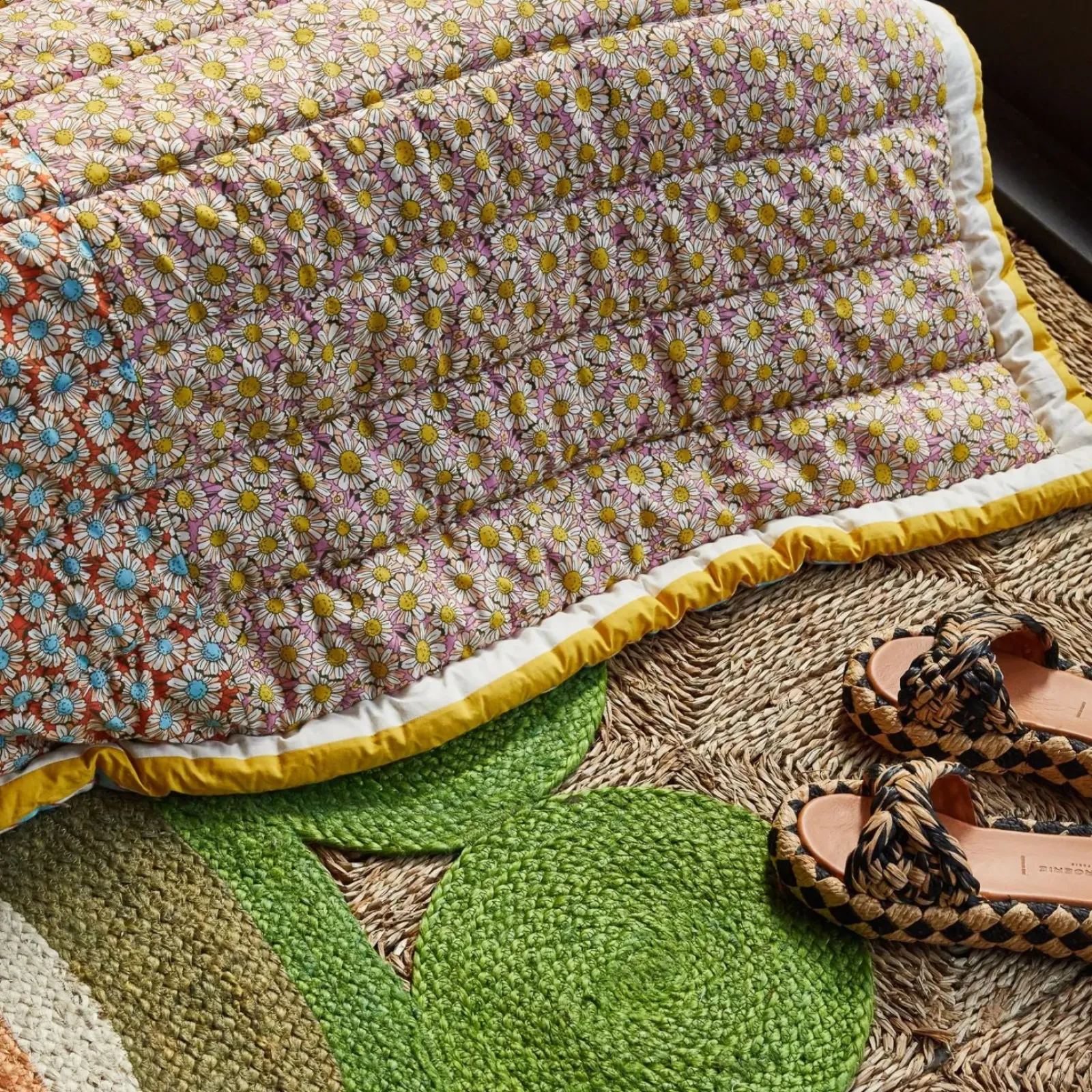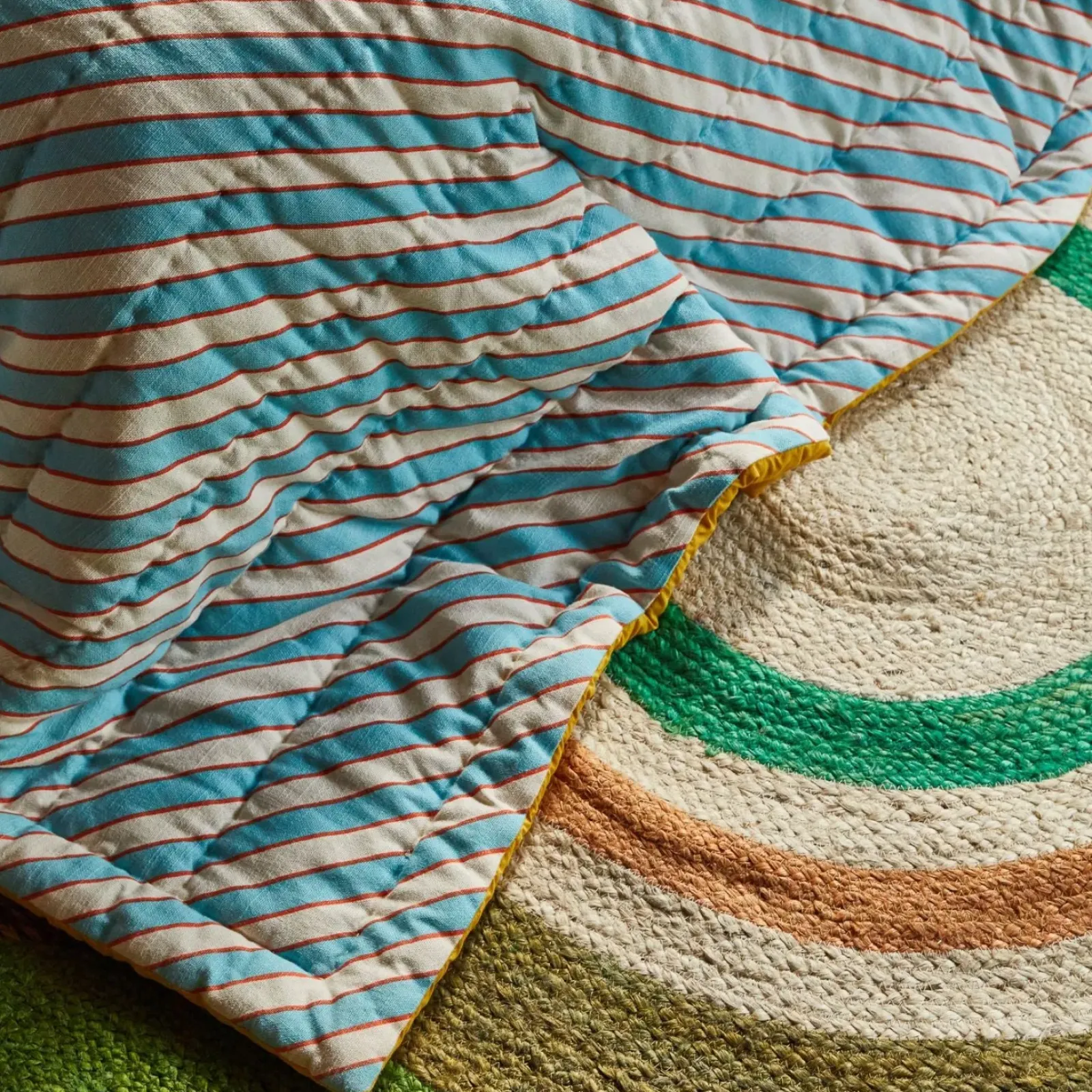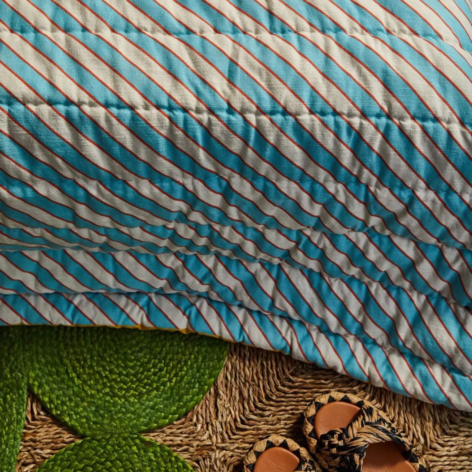 “Drawing on the nostalgic arts of patchwork and quilting, this plush and cosy bedcover offers two distinct looks in one. On one side, panels of dainty floral print in two complementary colorways bring the feel of thriving flower fields to life in your bedroom. On the other, slim diagonal stripes create a more timeless, soothing effect.” – Phoebe’s Style Notes
