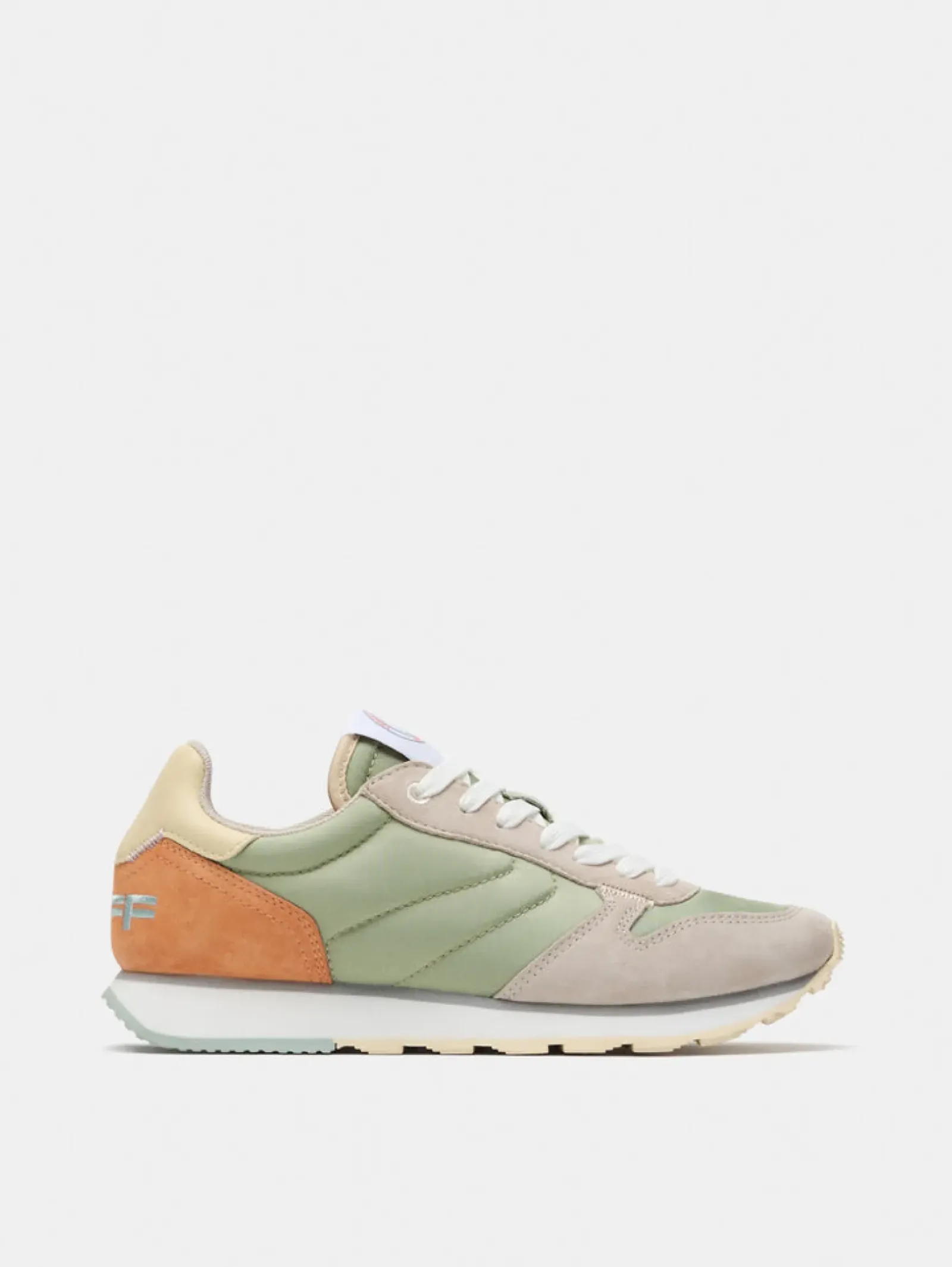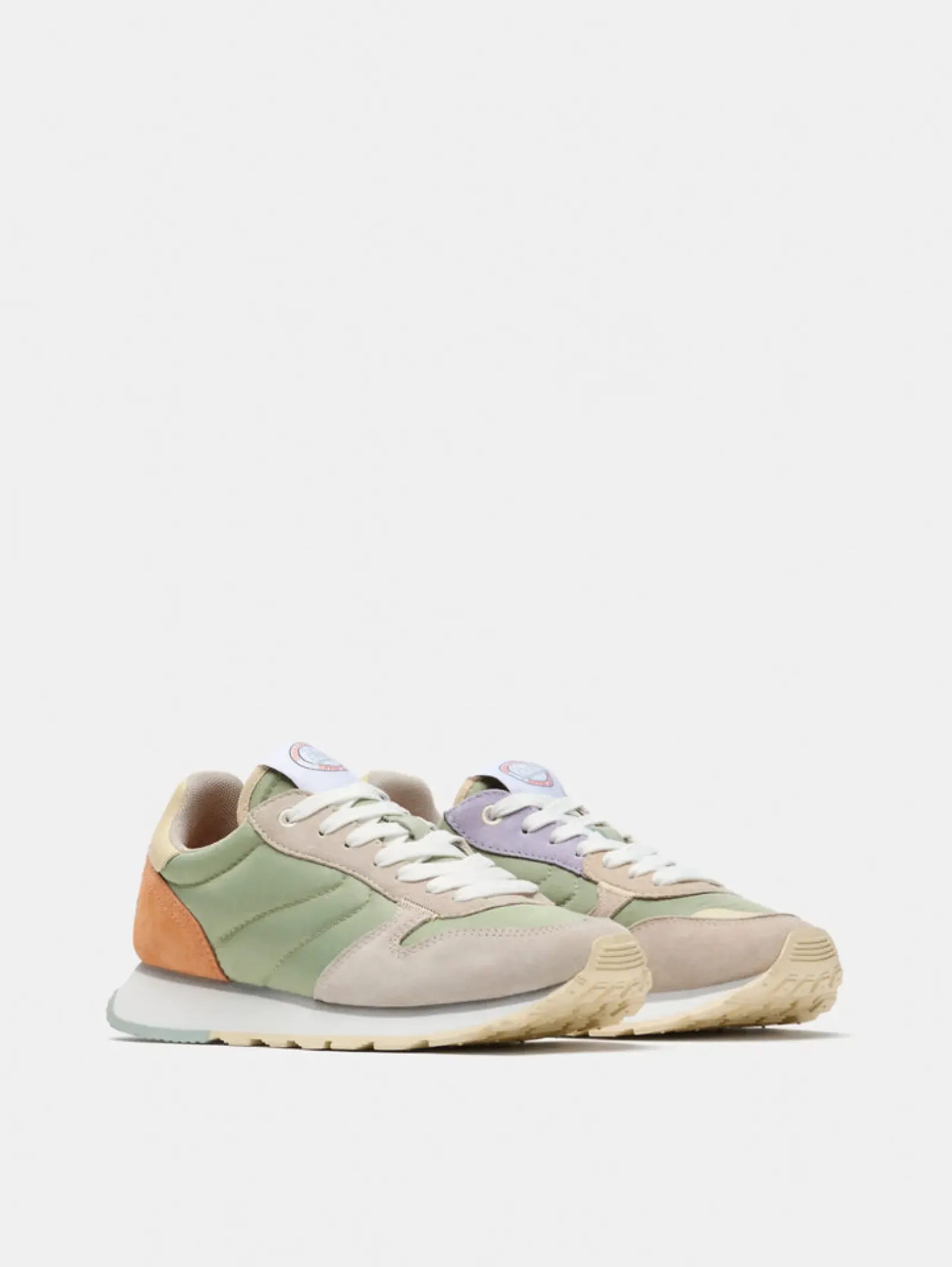 For lovers of retro and vintage style, theDELPHIin water green nylon with asymmetrical details in lilac and orange suede are the perfect blend to stand out anywhere. The mouse-gray suede at the front and the pastel yellow leather bring a premium touch. The waffle-designed sole in aquamarine and soft yellow, along with the embossed logo, is the cherry on top. Their lightness and comfort are guaranteed thanks to the memory-foam insole. They are perfect to pair with classic jeans and your favorite t-shirt.