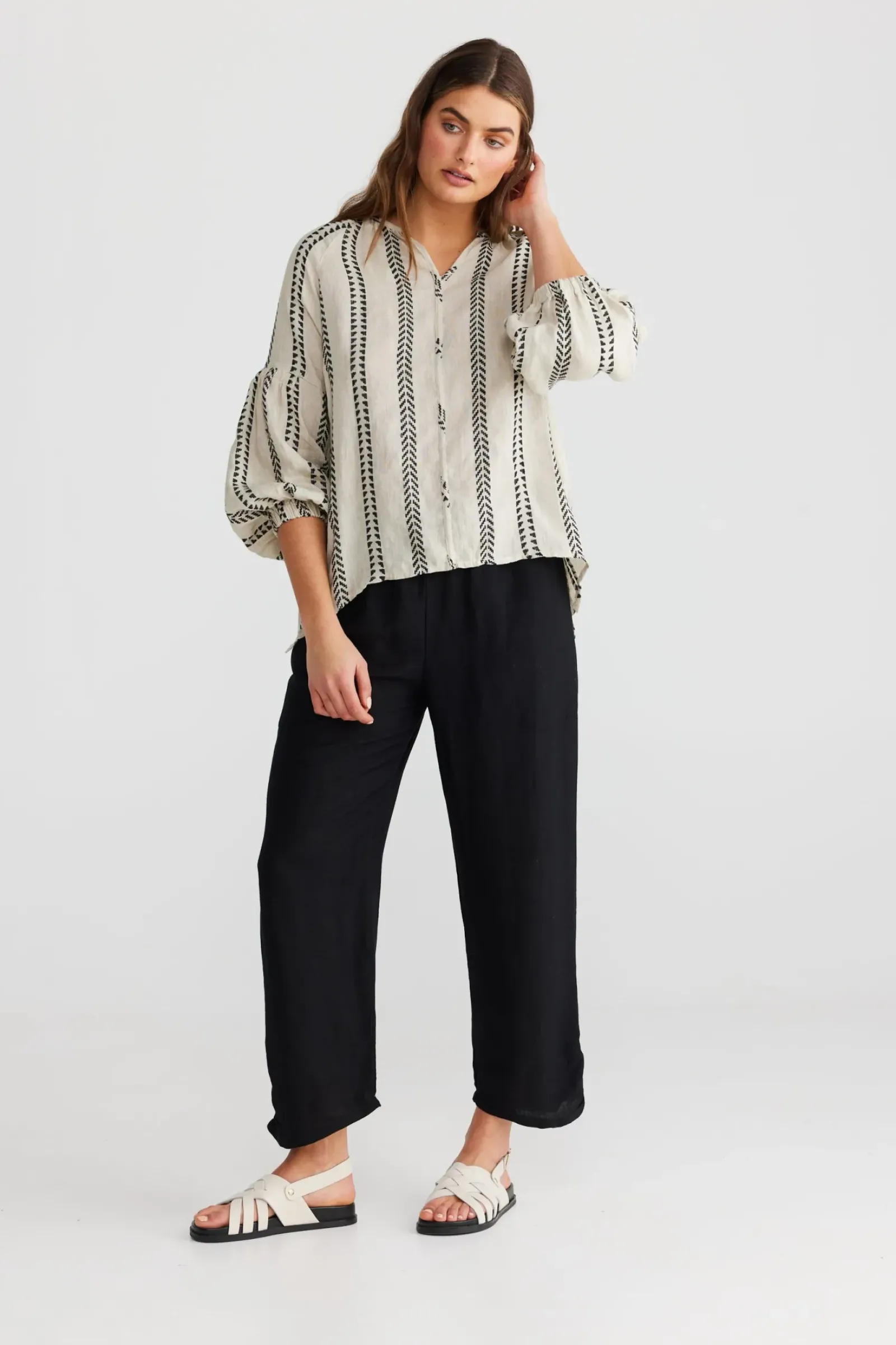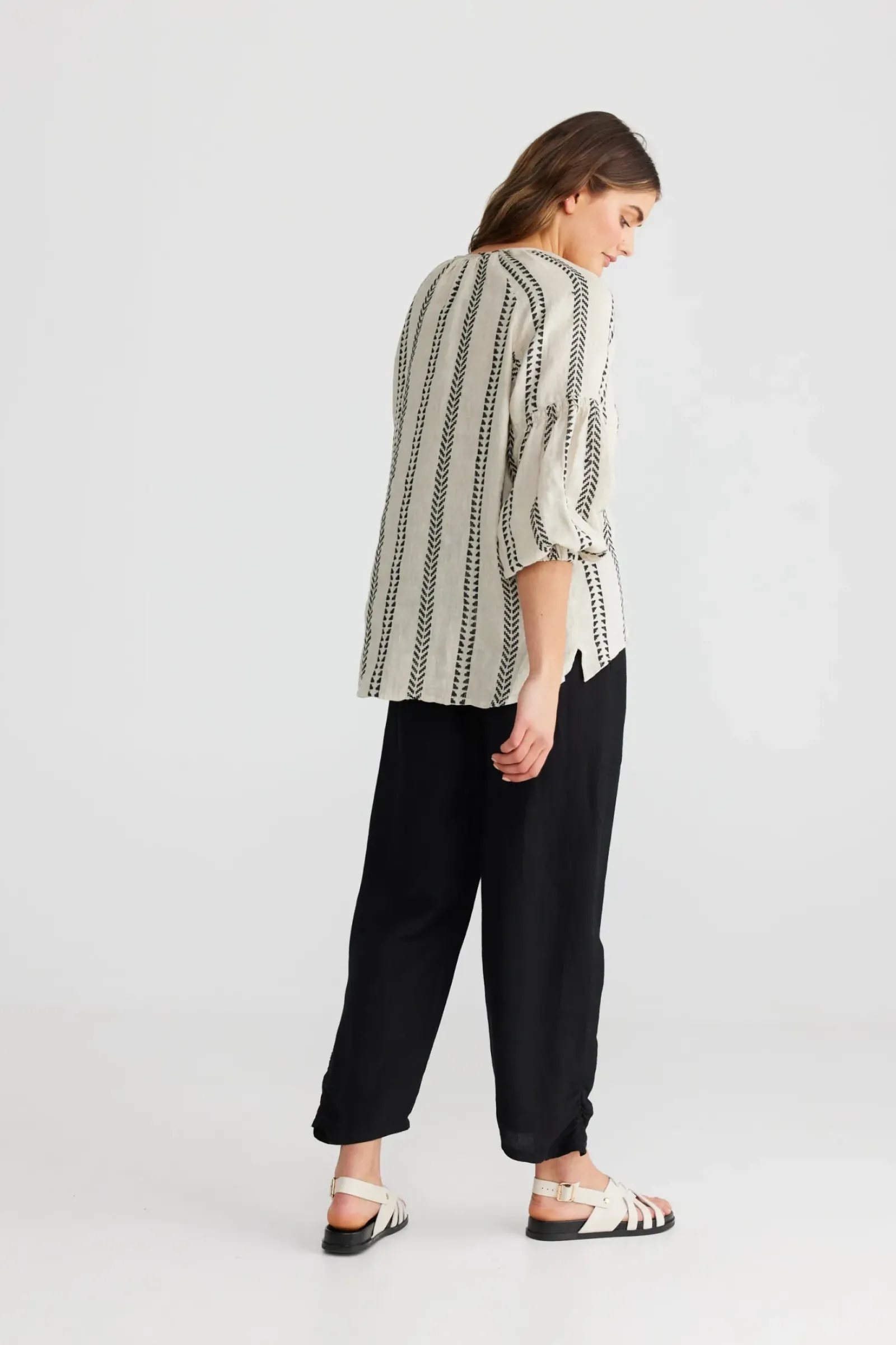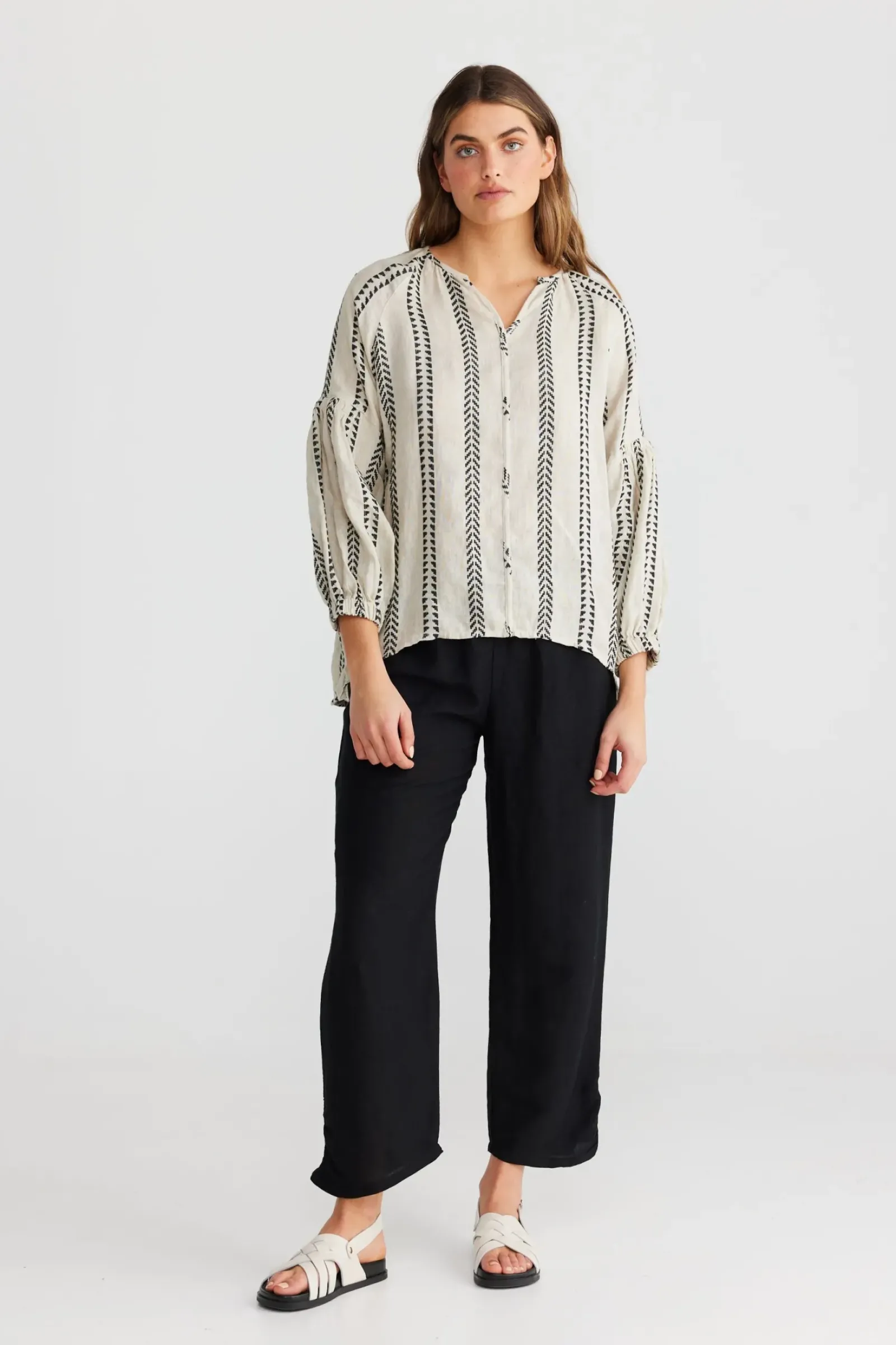 RAGLAN SLEEVESFREE FITTINGELASTICISED CUFFSELASTICISED FEATURE ON SLEEVEHAND WOVEN FABRICATION100% LINEN
