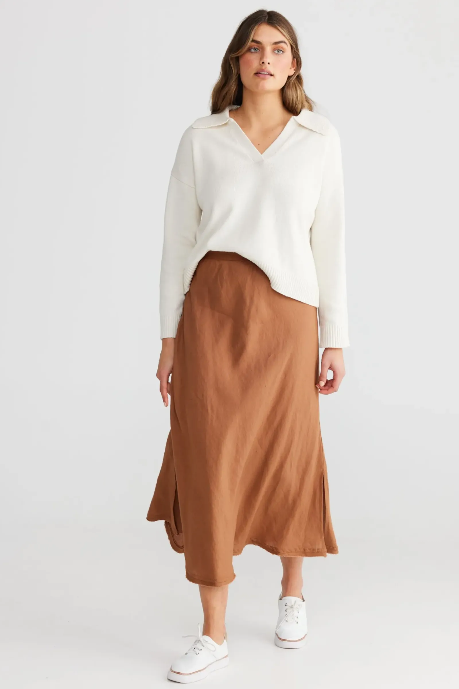 ANKLE LENGTHFLOWYELASTICISED WAISTBANDSIDE SPLITSBIAS CUTRAW EDGE TRIM55% LINEN / 45% VISCOSE