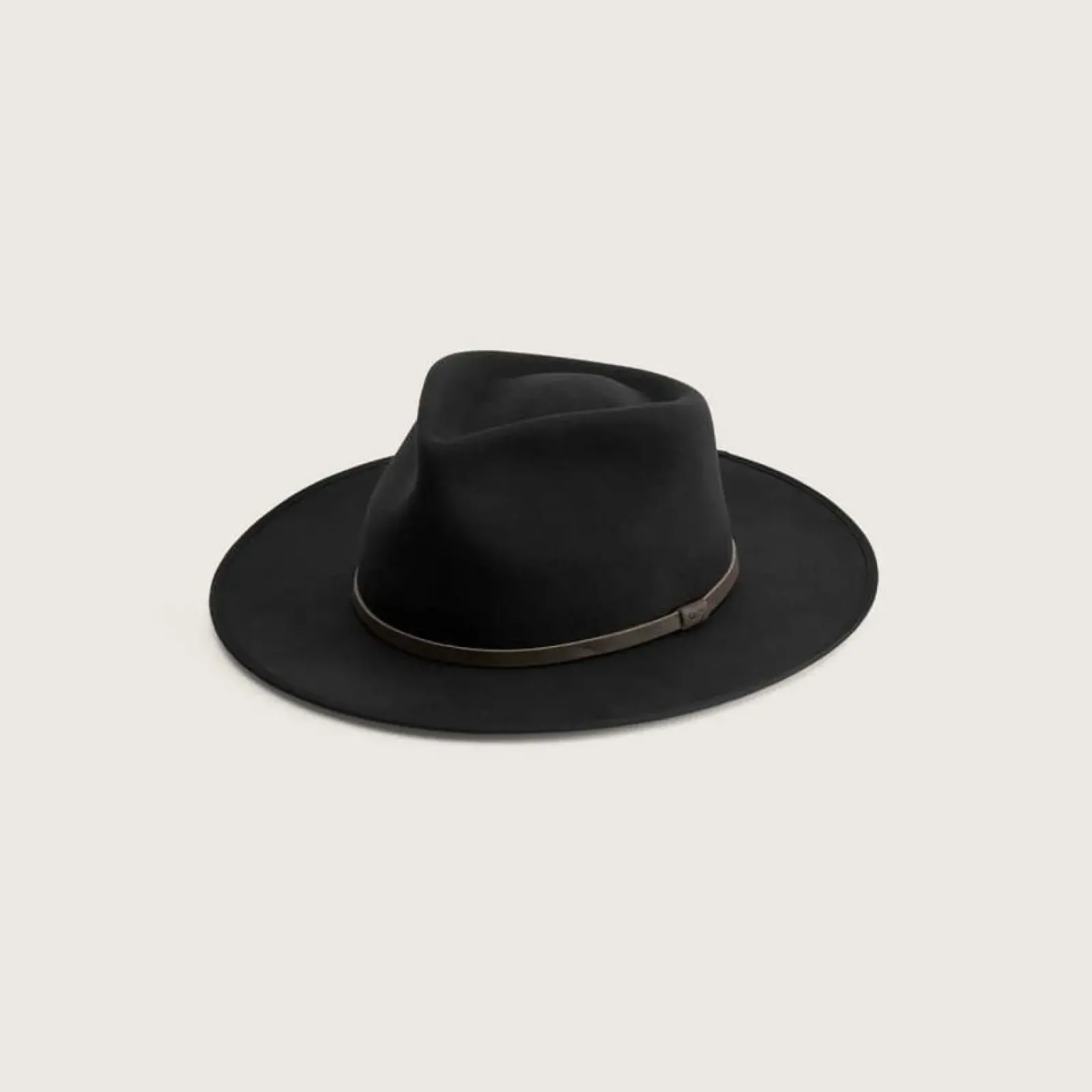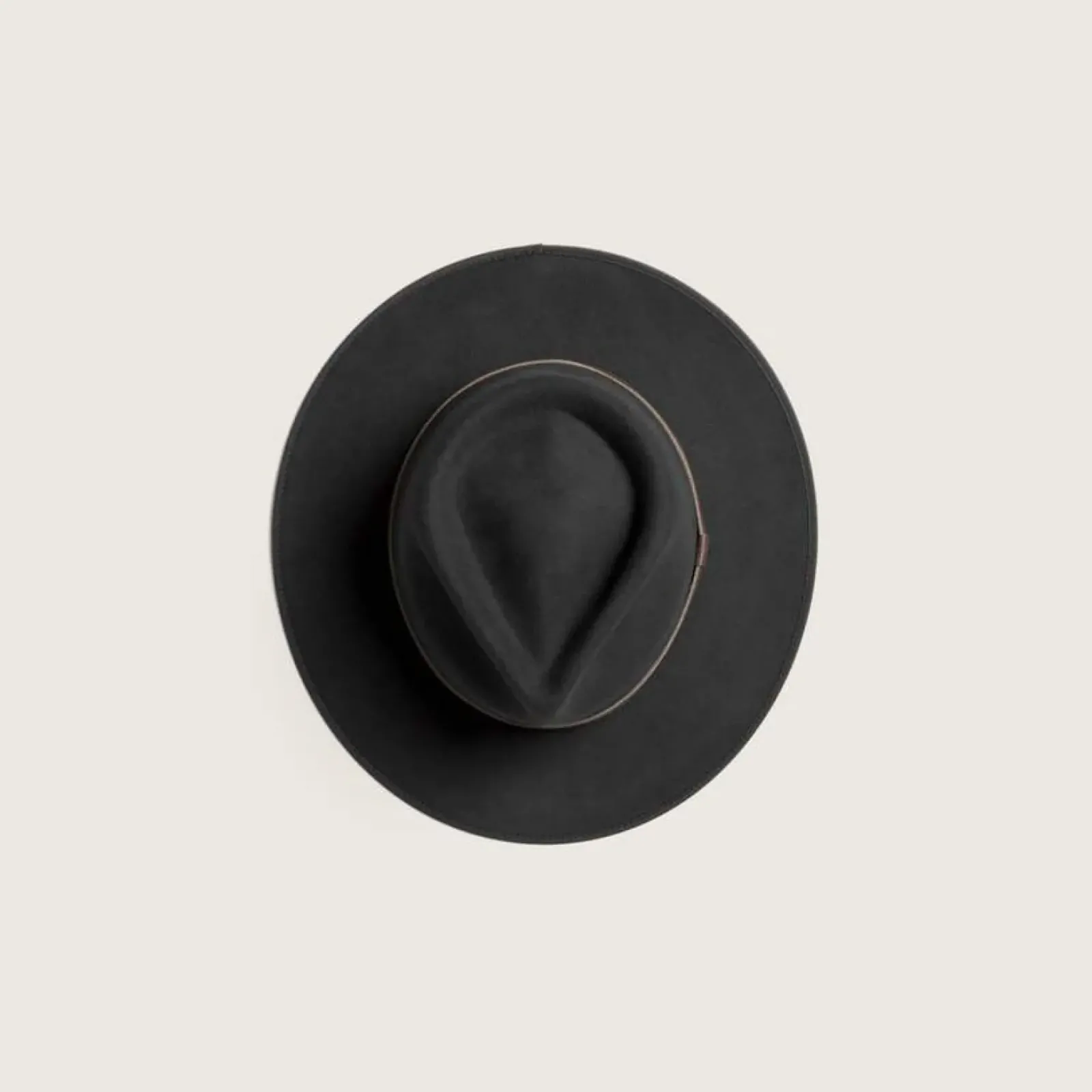 Calloway is our best selling style and is crafted from 100% Australian wool. Trimmed with our signature dark brown matte leather embossed band. It has a 7cm wide brim finished with a grosgrain bound edge to help it last the extra mile. Timeless & approachable wide brim black fedora that is perfectly suited to any adventure.