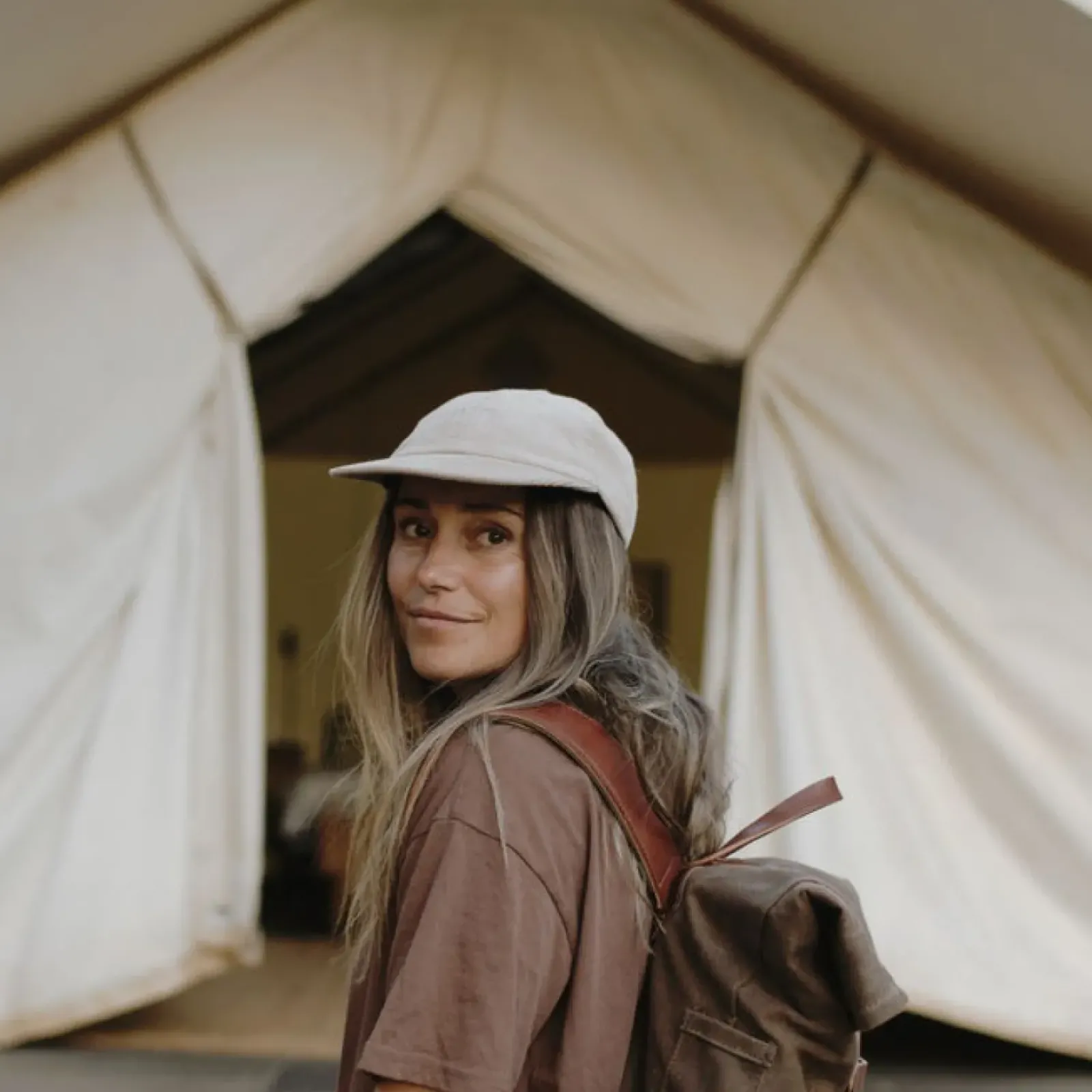 A beige 5-panel cap for men and women.