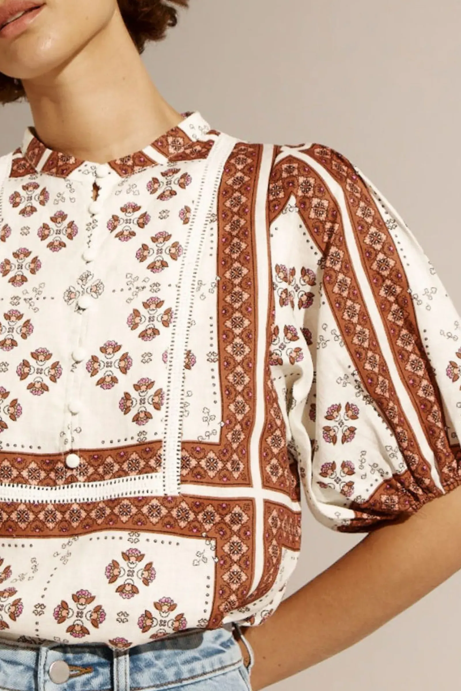 ladder lace trim creates a bid aesthetic on the bodice of the gleam. a short blouson sleeve is finished with an elasticated cuff and covered buttons enhance its delicate affect. the perfect choice for chic yet casual outfitting. see product details below.